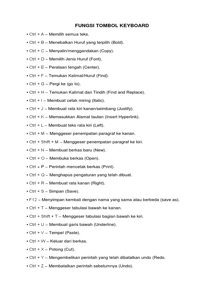 Ctrl Z - Membatalkan perintah sebelumnya Undo Sedangkan tombol functionF pada keyboard. Berfungsi untuk membuat teks menjadi rata kanan CtrlS. Ctrl V - Tempel Paste.
